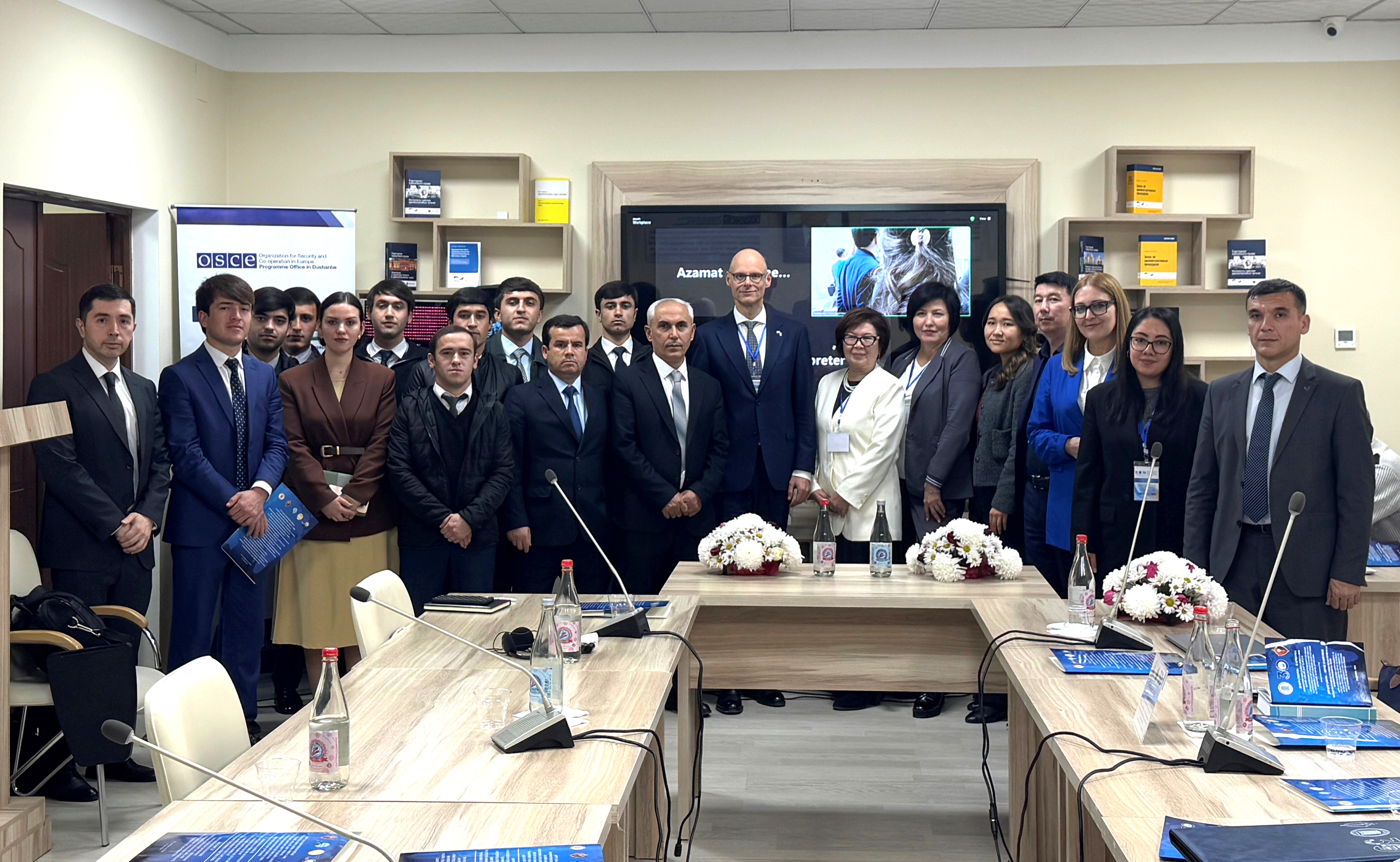 Participants of the International Scientific and Practical Conference, titled "The Prevention of Corruption as a Mechanism for Protecting Human Rights and Ensuring the Efficiency of Governance: Current Status and Prospects," organized by the OSCE Programme Office in Dushanbe and the Tajikistan Academy of Public Administration, gather for a group photo, Dushanbe, 4 December 2024.