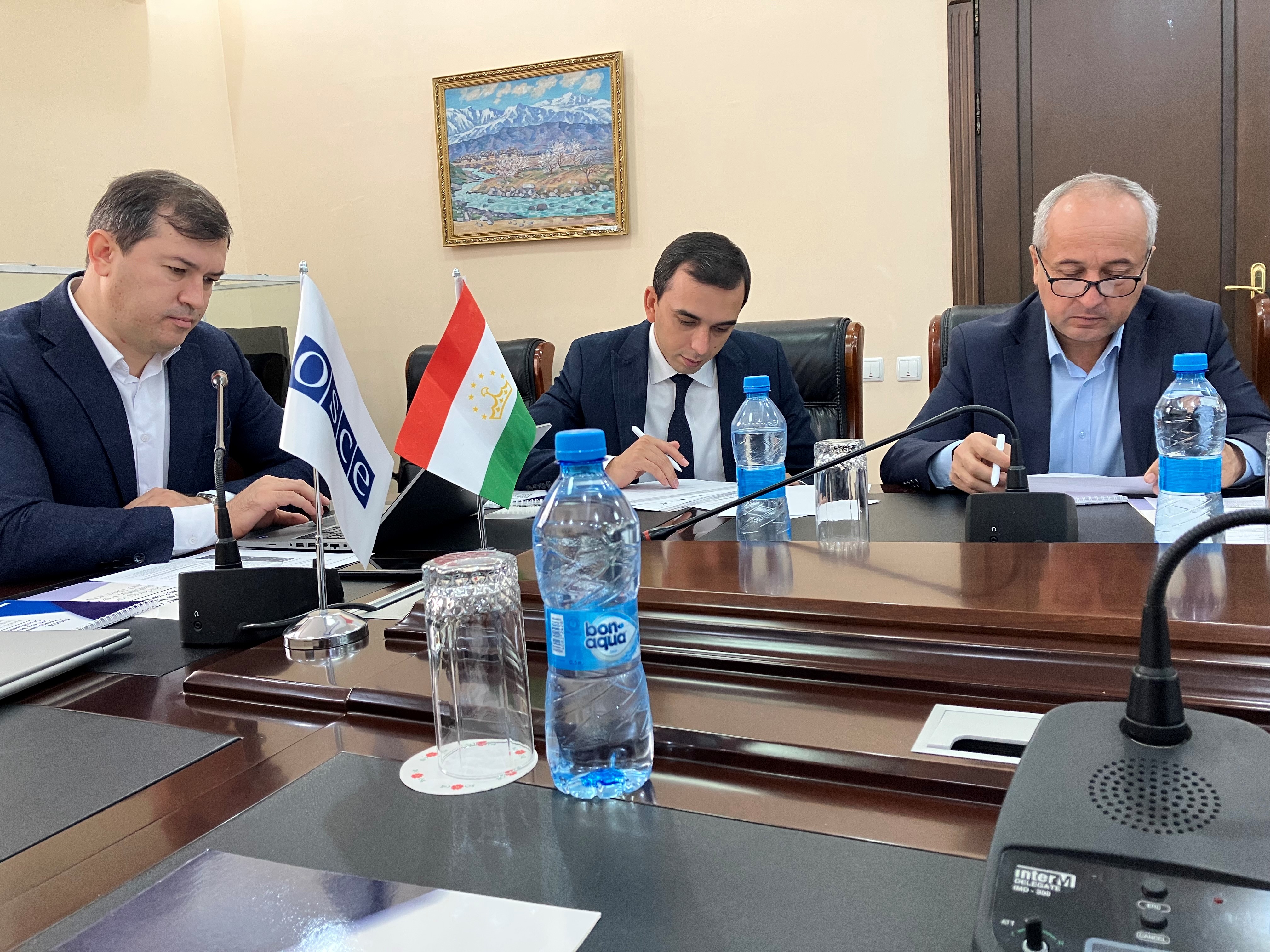 Officials from Tajikistan’s Ministry of Energy and Water Resources and the Agency for Land Reclamation and Irrigation participate in a one-day session on strengthening Tajikistan–Kyrgyzstan border water co-operation, Khujand, 17 October 2025.