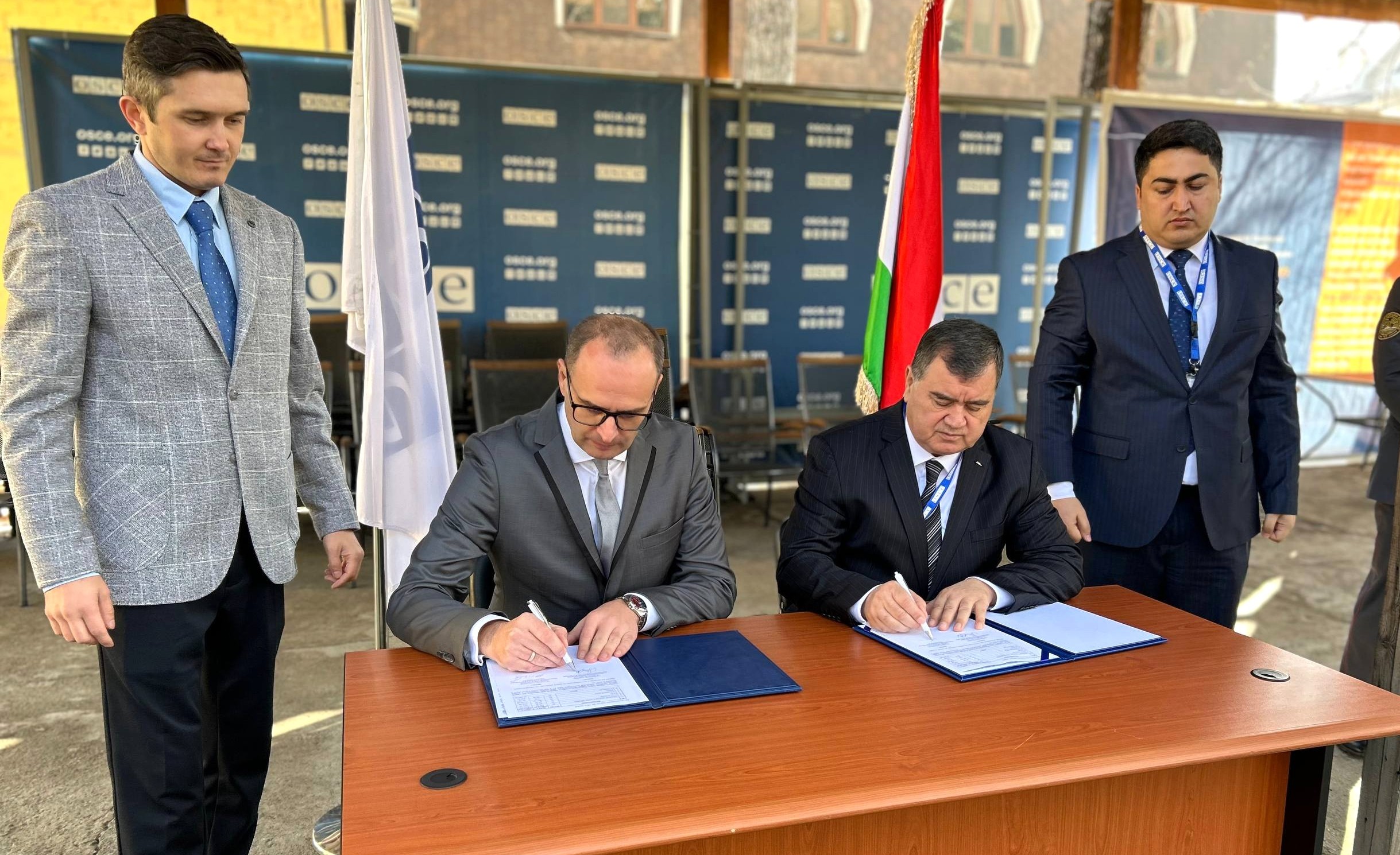 Miroslav Milojevic, Officer in Charge of the Political-Military Dimension at the OSCE Programme Office in Dushanbe (centre-left), and Major General Safiallo Azizullozoda, National Co-ordinator on Police Reform at Tajikistan’s Ministry of Internal Affairs (centre-right), during the handover ceremony of ICT equipment to the Ministry of Internal Affairs, Dushanbe, 11 November 2025.