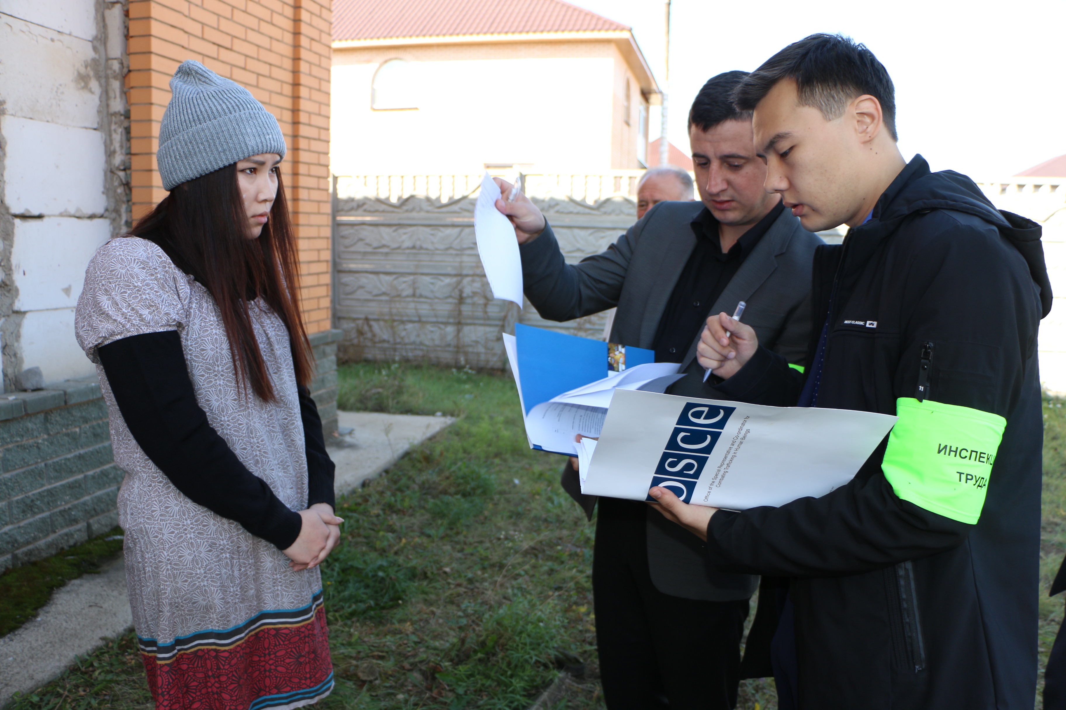 Security officials interviewing an actress, who plays a role of victim, to identify and provide the necessary assistance during the OSCE simulation exercise in Koschy, Kazakhstan, 26 September 2018.