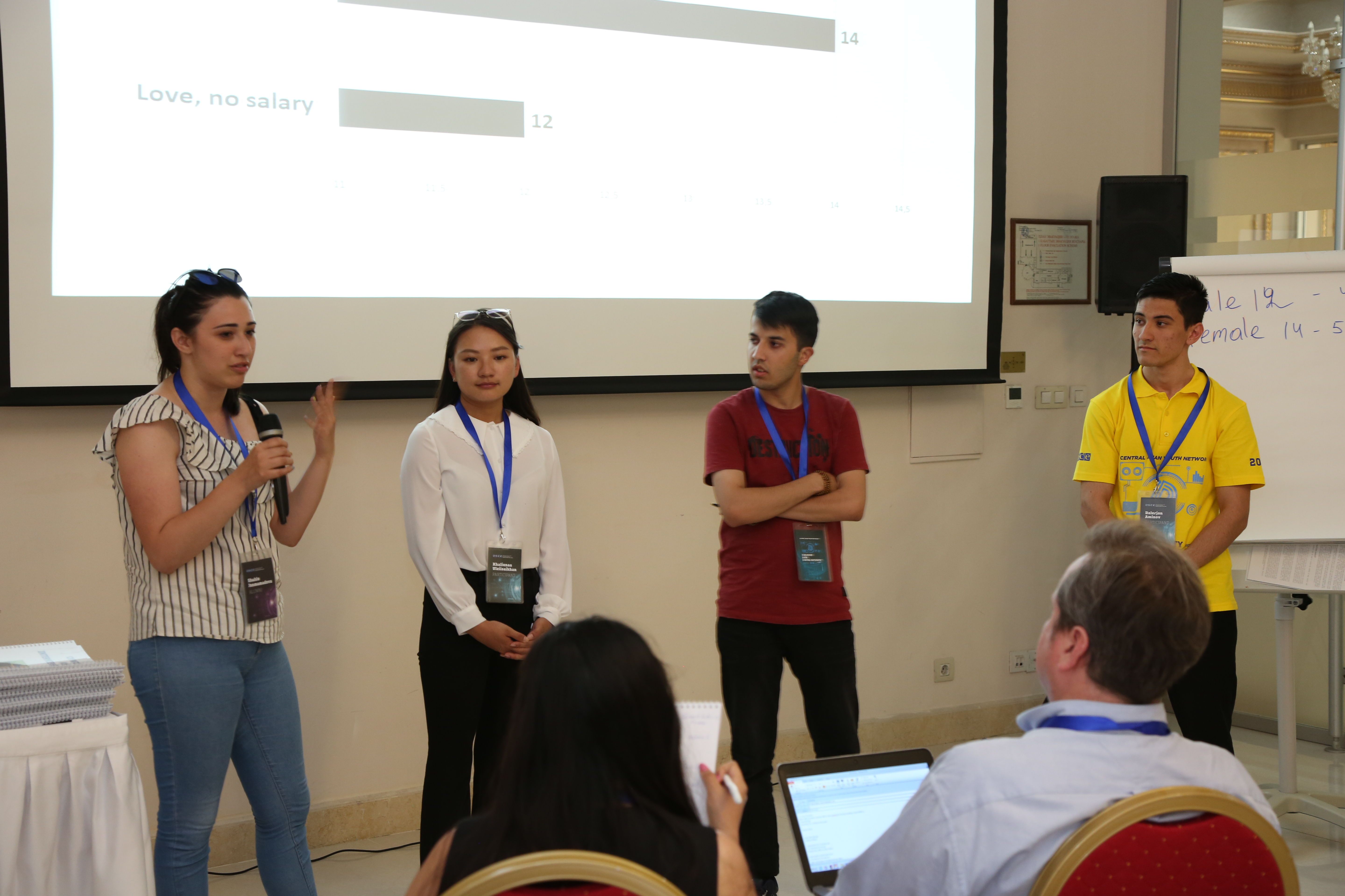 A group of students present the data collection results of the Scavenger Hunt research survey conducted among Almaty residents. Almaty, 26 June 2019.