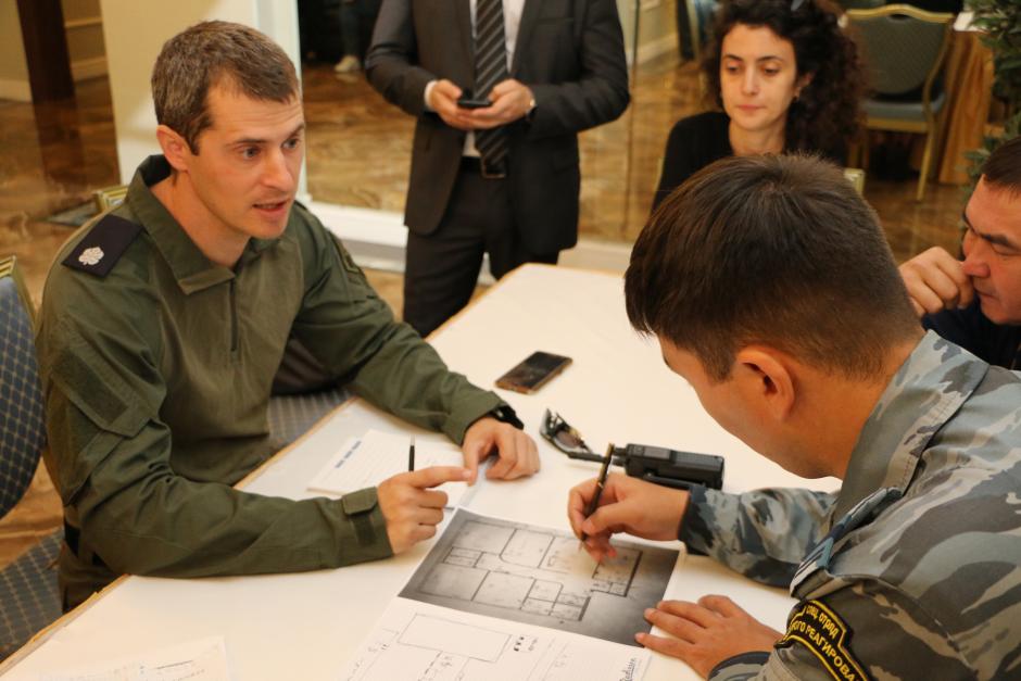 An expert from the Israel Police and participants of the training discussing a plan of action during a simulation exercise, Nur-Sultan, 20 September 2019.