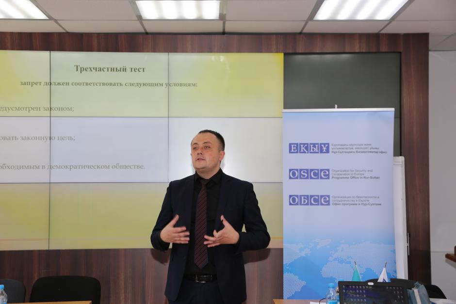 An international expert delivering a presentation at the training seminar for judges, Nur-Sultan, 12 November 2019.