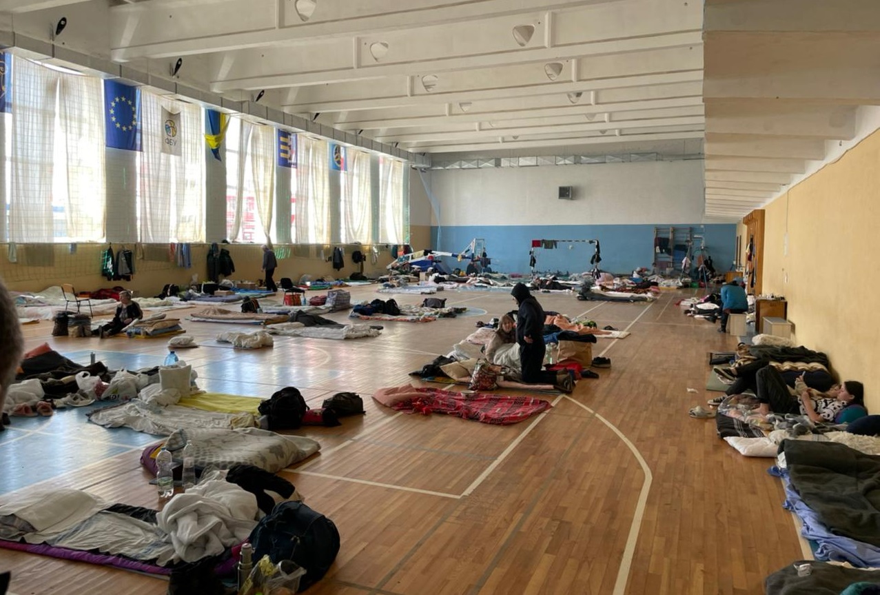 Sports hall in one of Uzhhorod’s schools turned to a shelter to host people relocated to western Ukraine because of the war, 8 April 2022. Vulnerability of IDPs increases risks of human trafficking.