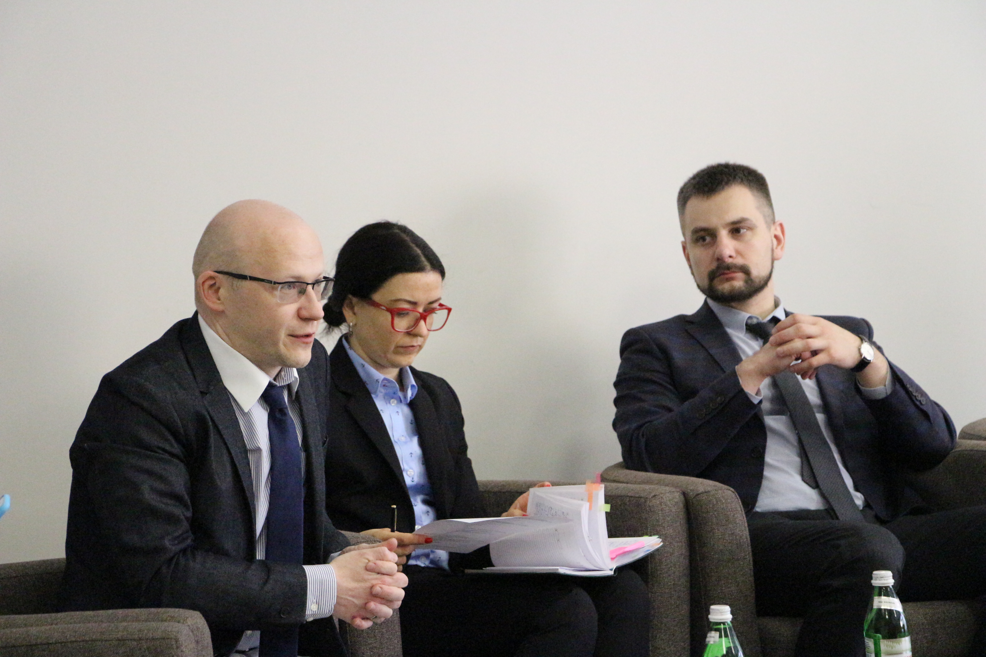 l-r: Oleksandr Vodyannikov, National Legal Adviser, OSCE Project Co-ordinator in Ukraine, Olha Nikolaeva, Legal Adviser, USAID New Justice Programme, and Markiyan Halabala, Legal expert, Reanimation Package of Reforms discuss the establishment and functioning of the High Anti-Corruption Court, Lviv, 27 April 2017.