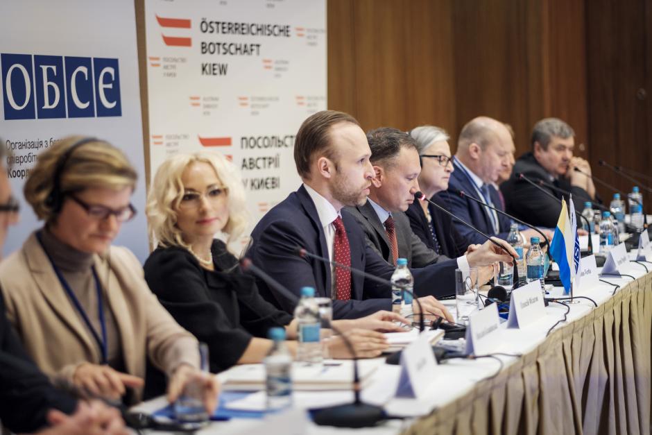(l-r) Ms. Edith Zeller, President of the European Association of Administrative Judges; Ms. Natalia Blazhivska, Vice-President of the All-Ukrainian Association of Administrative Judges; Mr. Olexiy Filatov, Deputy Head of the Administration of the President of Ukraine; His Excellency Mr. Vaidotas Verba, Ambassador, OSCE Project Co-ordinator in Ukraine; Her Excellency Ms. Hermine Popeller, Ambassador of the Republic of Austria to Ukraine; Mr. Mykhaylo Smokovych, Acting Head of the High Administrative Court of Ukraine; Mr. Mykola Onishuk, Rector of the National School of Judges discussing Austria and Ukrainian experience in administrative justice, 28 September 2017.