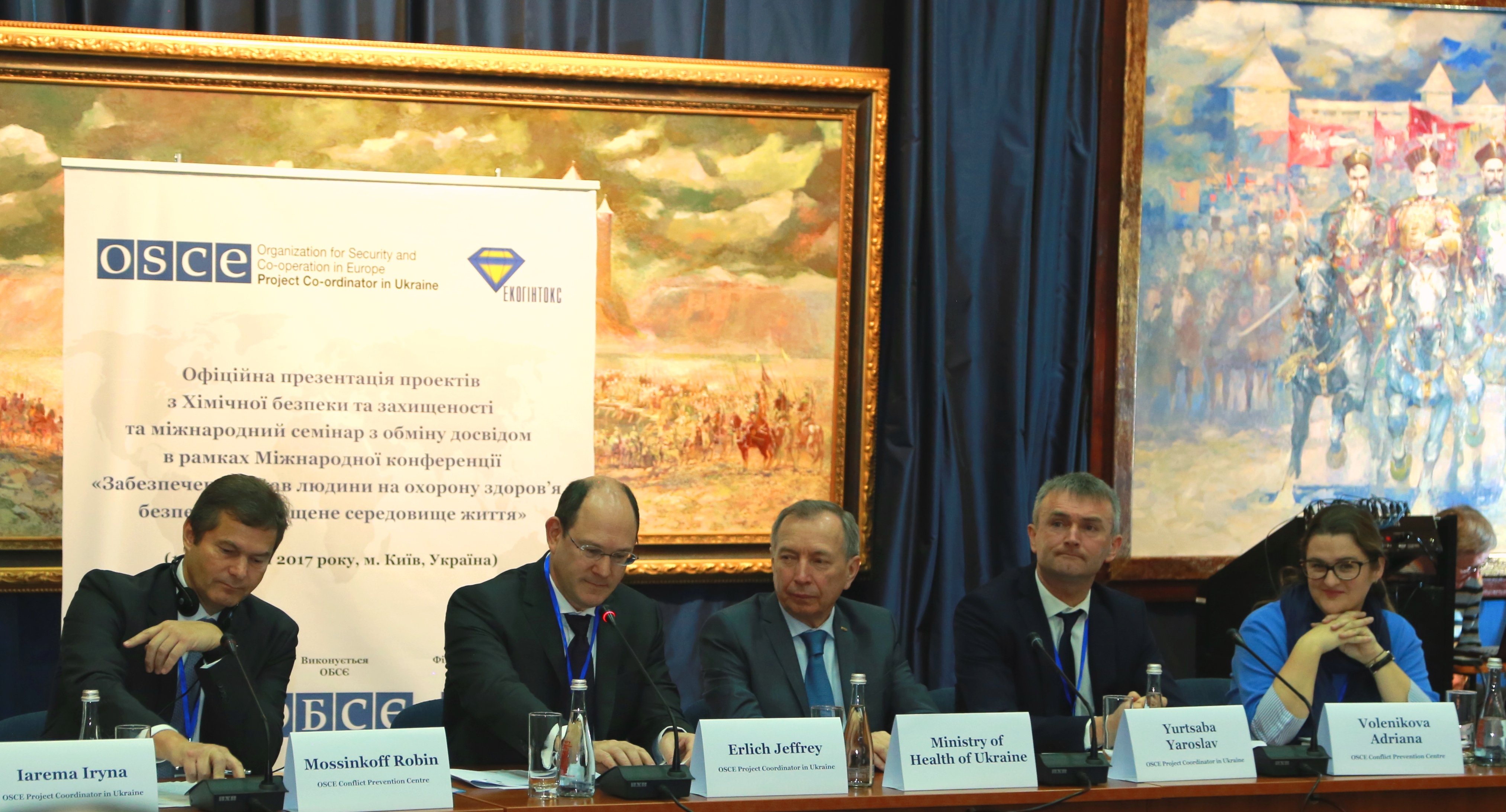 Robin Mossinkoff(l), Head of the FCS Support Unit, OSCE CPC, Jeffrey Erlich, Senior Project Officer, OSCE PCU, Mykola Prodanchuk, Director of ECOHYNTOX, Ministry of Health of Ukraine, Yaroslav Yurtsaba, National Programme Manager OSCE PCU and Adriana Volenikova Associate Project Officer OSCE CPC participating in the Chemical Safety and Security Projects Kick-off Meeting and Experience Sharing Workshop, Kyiv, 11 December 2017.