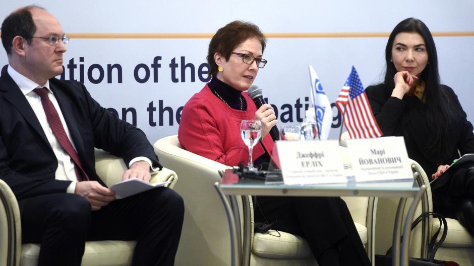 (L-r) Jeffrey Erlich, Senior Project Officer of OSCE Project Co-ordinator in Ukraine, H.E. Marie Yovanovitch, U.S. Ambassador to Ukraine, Tetiana Kovalchuk, Deputy Minister of Internal Affairs of Ukraine, discussing the results on combating trafficking in human beings in Ukraine, Kyiv, 27 February 2018.