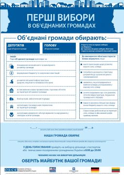 Poster in Ukrainian is devoted to the first elections in amalgamated communities and describes duties and responsibilities of the officials to be elected at the first elections. Available only in Ukrainian.