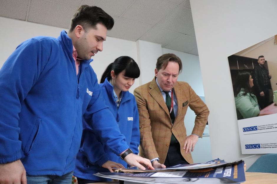 From right to left: Henrik Villadsen, OSCE Project Coordinator in Ukraine, Tetiana Medun, Human Security Programme project officer and Dmytro Karakonstiantyn, Project Assistant are examining posters with messages to promote better law enforcement response to domestic violence before they are shipped to police departments across Ukraine. 6 March 2020.
