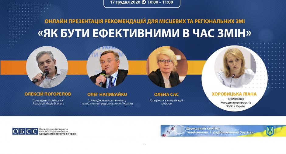 The event will present recommendations that were elaborated by a group of experts based on a comprehensive study of the processes taking place in newsrooms, factors influencing their work, challenges in interacting with communities in the process of decentralization. The study, performed in October-November 2020 included inter alia a survey of editors and managers of local media of all forms of ownership and all types. It focused on (a) assessing the situation in the local media economy in Ukraine and (b) identifying the most effective ways to support their development. During the research the information about the work of local media in the context of decentralization were collected and analysed, particular attention was paid to their interaction with partners, especially new amalgamated communities.