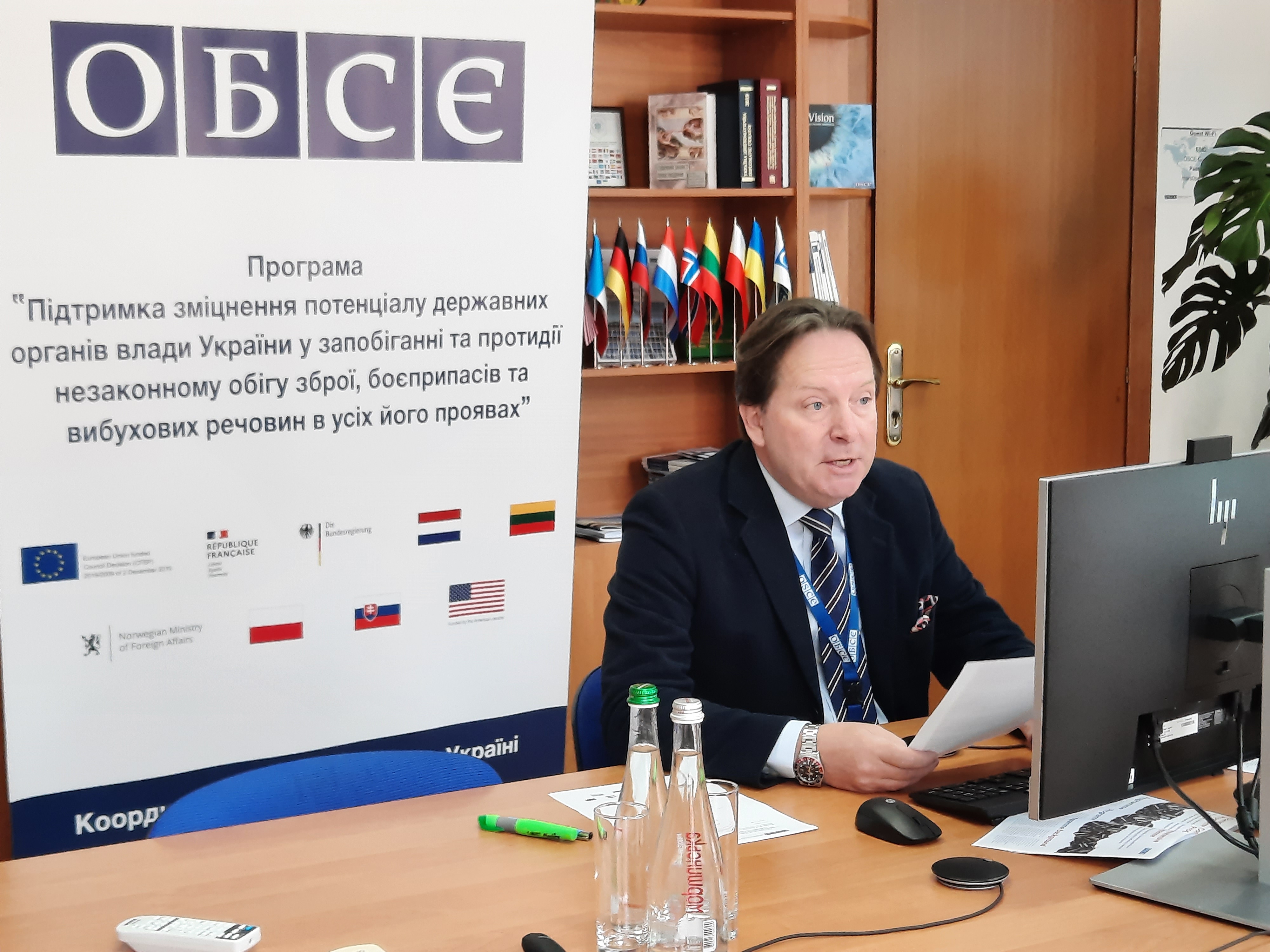 Henrik Villadsen, OSCE Project Co-coordinator in Ukraine, during the Governance board meeting of the OSCE Comprehensive Programme on “Strengthening capacities of Ukrainian authorities in preventing and combating illicit trafficking in weapons, ammunition and explosives in all its aspects”, 14 April 2021.