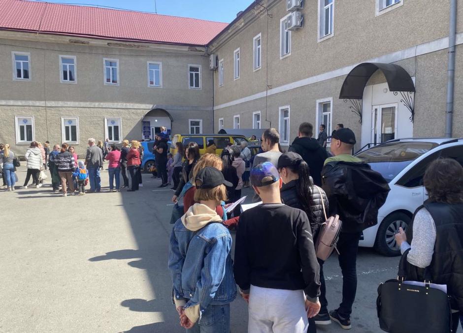 Internally displaced persons staying in line to get their documentation in front of administrative service center in Chernivtsi, 15 April 2022.