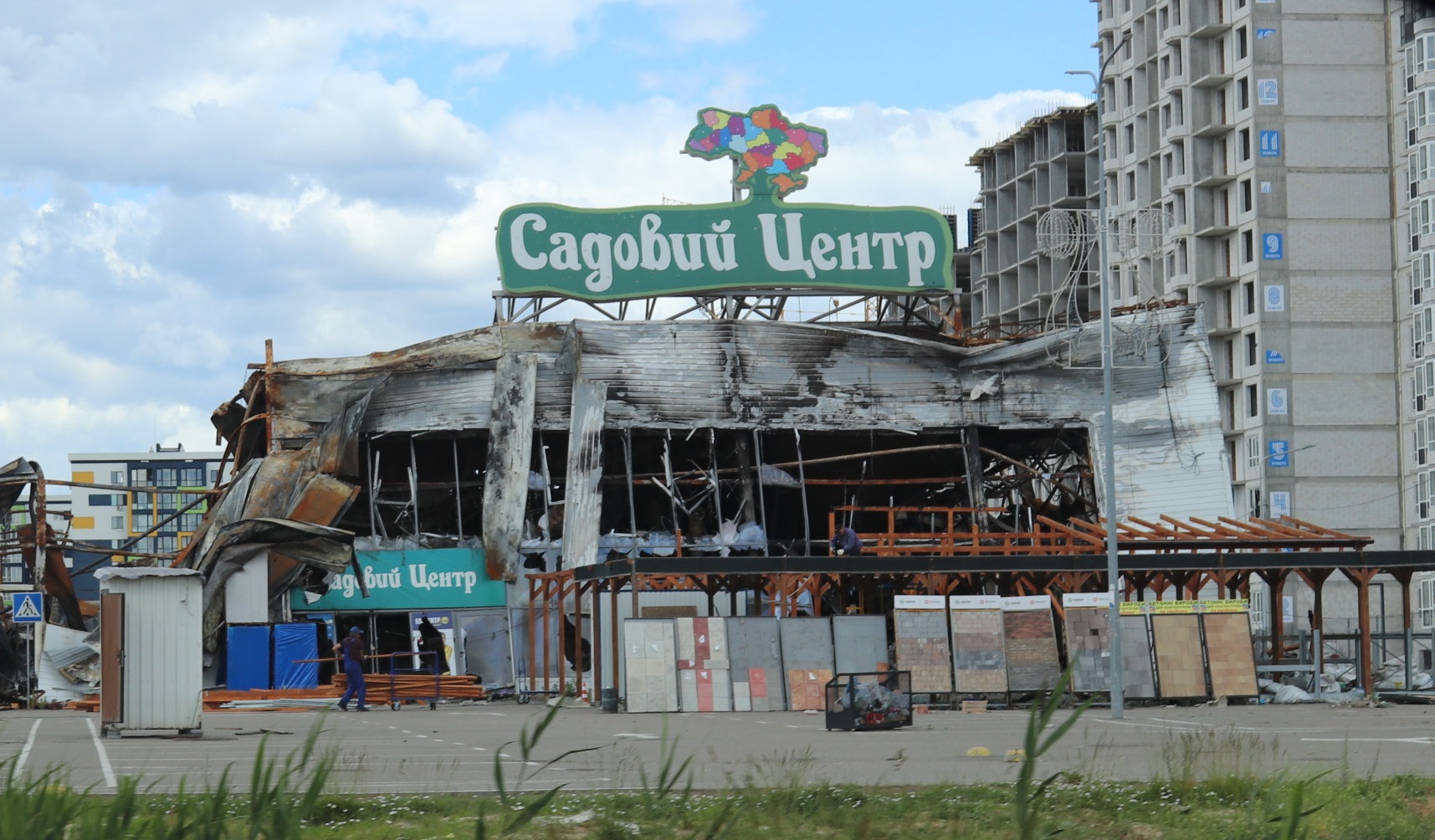 The town of Bucha is surrounded by numerous damaged business facilities that are now in dire need of capital investment, as e.g. this ruined garden supermarket.