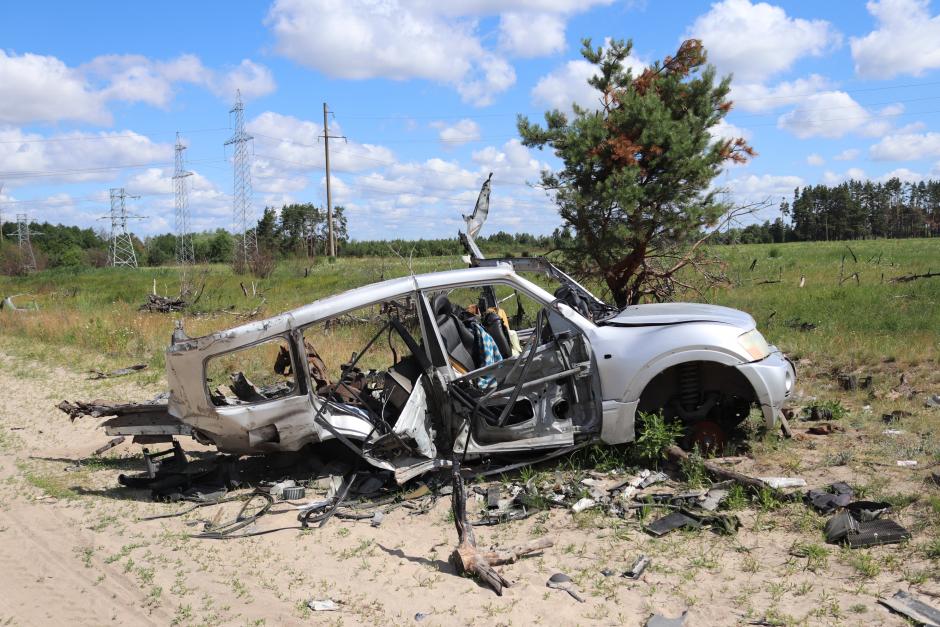 Getting back to normal life in the war-affected communities is often a dangerous endeavor. Remnants of a car in Lypivka near Makariv remind of a tragedy that happened when an electricity repair team encountered an anti-vehicle mine.