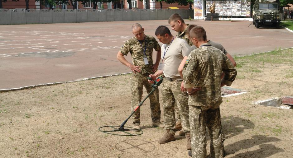 Ukrainian demining specialists from Ministry of Defence and State Emergency Service are trained to use metal detectors provided by the OSCE Project Co-ordinator at a training ground of State Special Transport Service in Chernihiv. 28-30 May 2019 (OSCE)