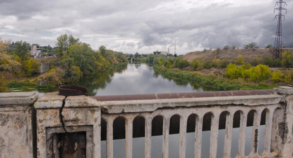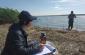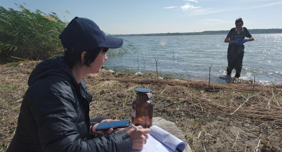 Experts collect samples of water at Kleban Byk lake, Donetsk Oblast, to perform chemical analysis as part of a project implemented by the OSCE Project Co-ordinator to enhance capacity of Ukraine in monitoring of environmental threats, 30 September 2018. (OSCE/Maxym Levin)
