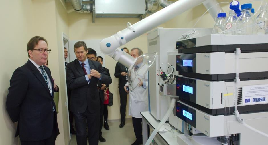 Henrik Villadsen, the OSCE Project Co-ordinator in Ukraine (left) examines the equipment, provided to Medved’s Research Center of Preventive Toxicology, Food and Chemical Safety to enhance its ability to identify unknown substances. Kyiv, 10 December 2019 (Maksym Levin/OSCE)