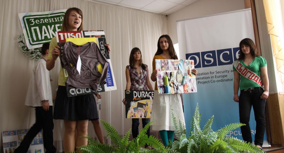 Students of secondary school no. 211 in Kyiv give a performance on the importance of preserving the environment to introduce the Green Pack educational materials, 14 April 2010. (OSCE/Oksana Polyuga)