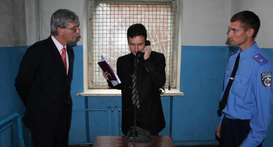 Lubomir Kopaj (l), OSCE Project Co-ordinator in Ukraine, with Yuriy Chumak (c), Ukrainian ministerial adviser on human rights, check the hotline for detainees during a visit to a detention centre, 4 September 2009. (OSCE/Oksana Polyuga)
