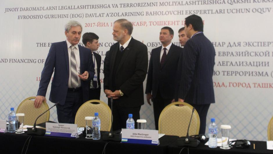 Vladimir Nechaev(l), Executive Secretary of The Eurasian Group on combating money laundering and financing of terrorism and Ambassador John MacGregor, OSCE Project Co-ordinator in Uzbekistan prior to opening of the seminar, Tashkent, 11 December 2017.