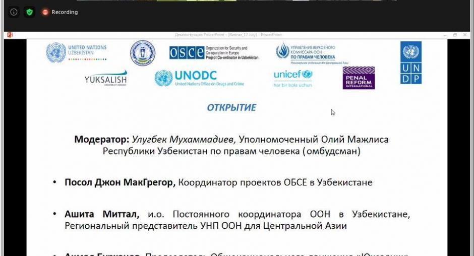 The OSCE Project Co-Ordinator in Uzbekistan held an online conference on national and international experiences in liberalizing judicial and penitentiary systems on 17 July 2020, to mark Nelson Mandela International Day. The event was jointly organized with the Commissioner for Human Rights of the Oliy Majlis (parliament) of the Republic of Uzbekistan (Ombudsperson), the national movement Yuksalish, the UN Country Team and the regional office of NGO Prison Reform International in Central Asia (PRI).