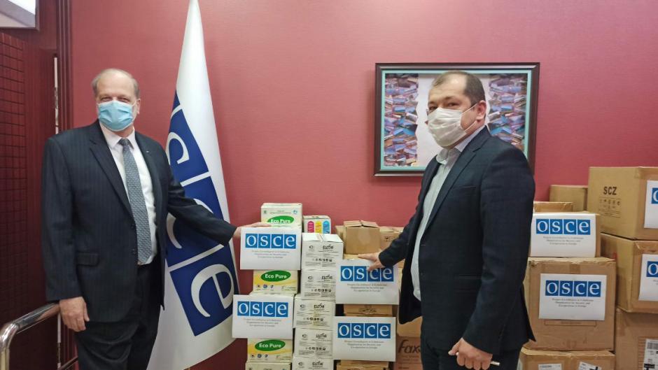 John MacGregor, Project Co-ordinator in Uzbekistan handing over humanitarian aid to the Deputy Director of the Agency for External Labour Migration under the Ministry of Employment and Labour Relations of the Republic of Uzbekistan, Hojiakbar Fayzullahodjayev, Tashkent, 5 February 2021.