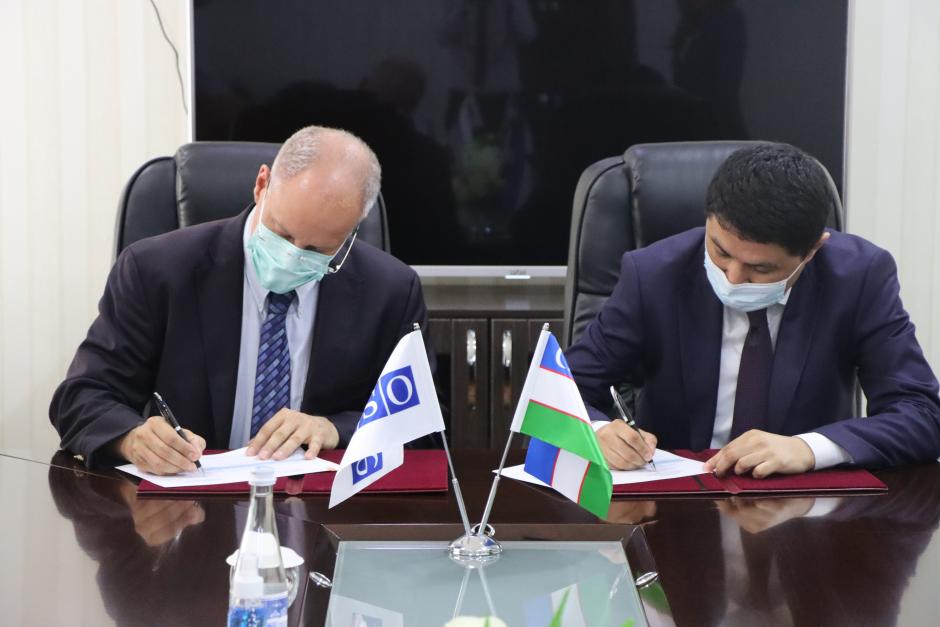 Signing of a working plan for 2021 by Ambassador Pierre Von Arx, OSCE Project Co-ordinator in Uzbekistan and Mr. Akmal Burkhanov, Director of Anti-corruption Agency of the Republic of Uzbekistan