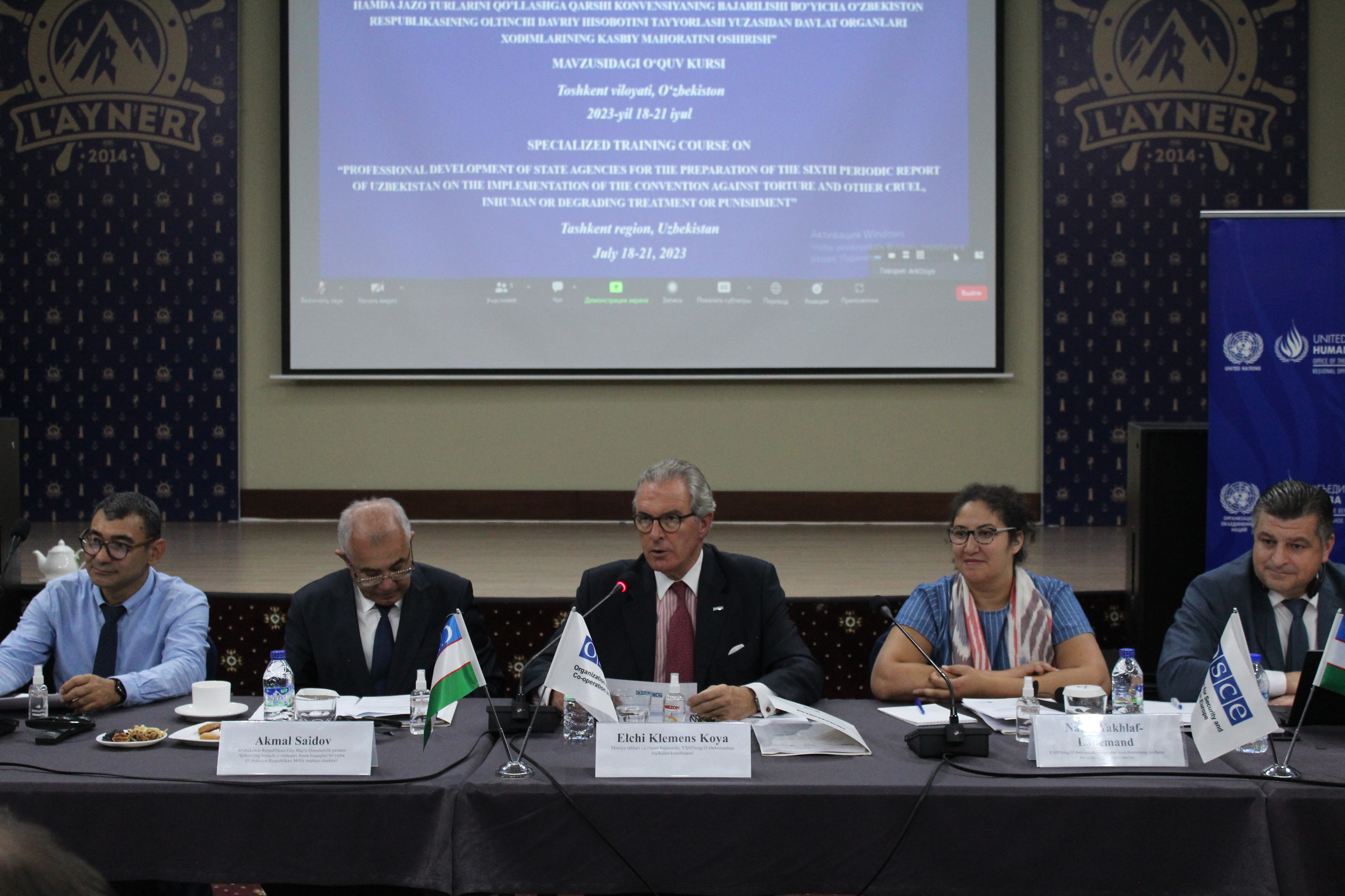 Opening session of the specialized training course “Professional Development of State Agencies for the Preparation of the Sixth Periodic Report of Uzbekistan on the Implementation of the [United Nations] Convention Against Torture and Other Cruel, Inhuman or Degrading Treatment or Punishment”, 18-21 July 2023, Tashkent region.