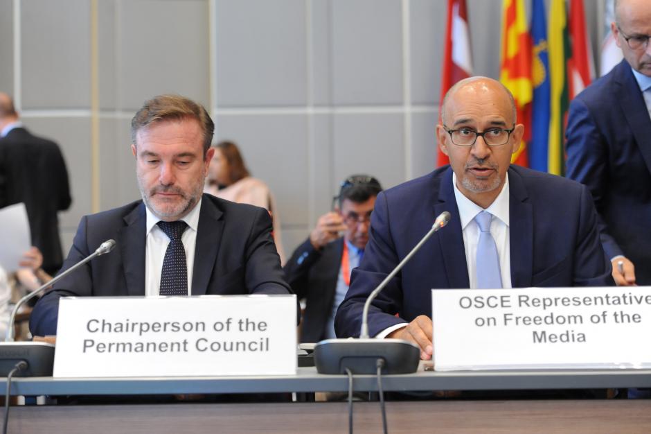 OSCE Representative on Freedom of the Media Harlem Désir presents his biannual report to the OSCE Permanent Council in Vienna, 5 July 2018.