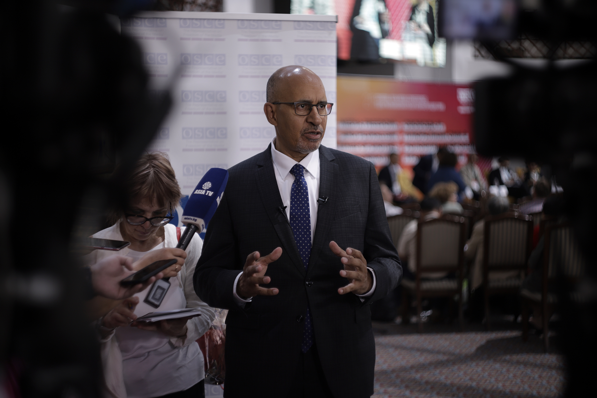 Harlem Désir, OSCE Representative on Freedom of the Media takes questions from the media at the 21st Central Asia Media Conference, Bishkek, 17 July 2019.