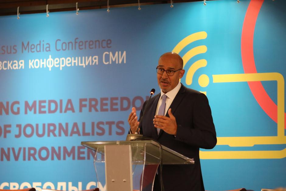 Harlem Désir, OSCE Representative on Freedom of the Media delivering his opening remarks at the 16th South Caucasus Media Conference, Tbilisi, 9 October 2019.
