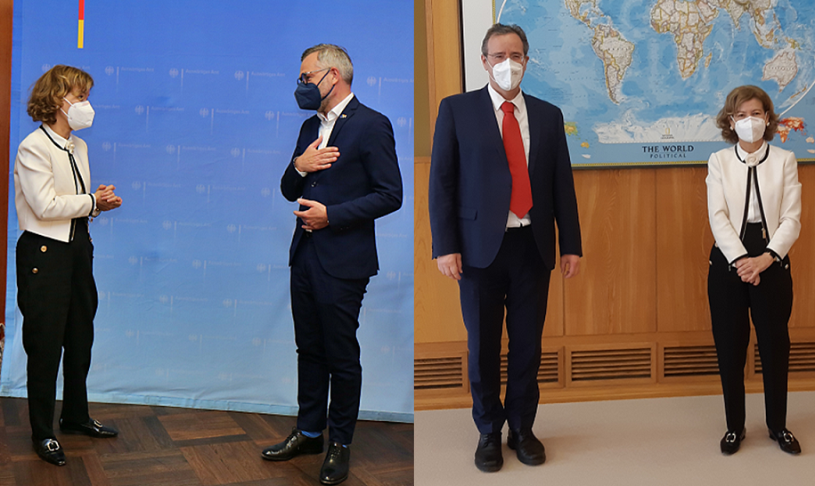 The OSCE Representative on Freedom of the Media, Teresa Ribeiro, met on her visit to Berlin, Germany, amongst others with Michael Roth, State Minister for Europe (left) and Miguel Berger, State Secretary Federal Foreign Office, 20 May 2021