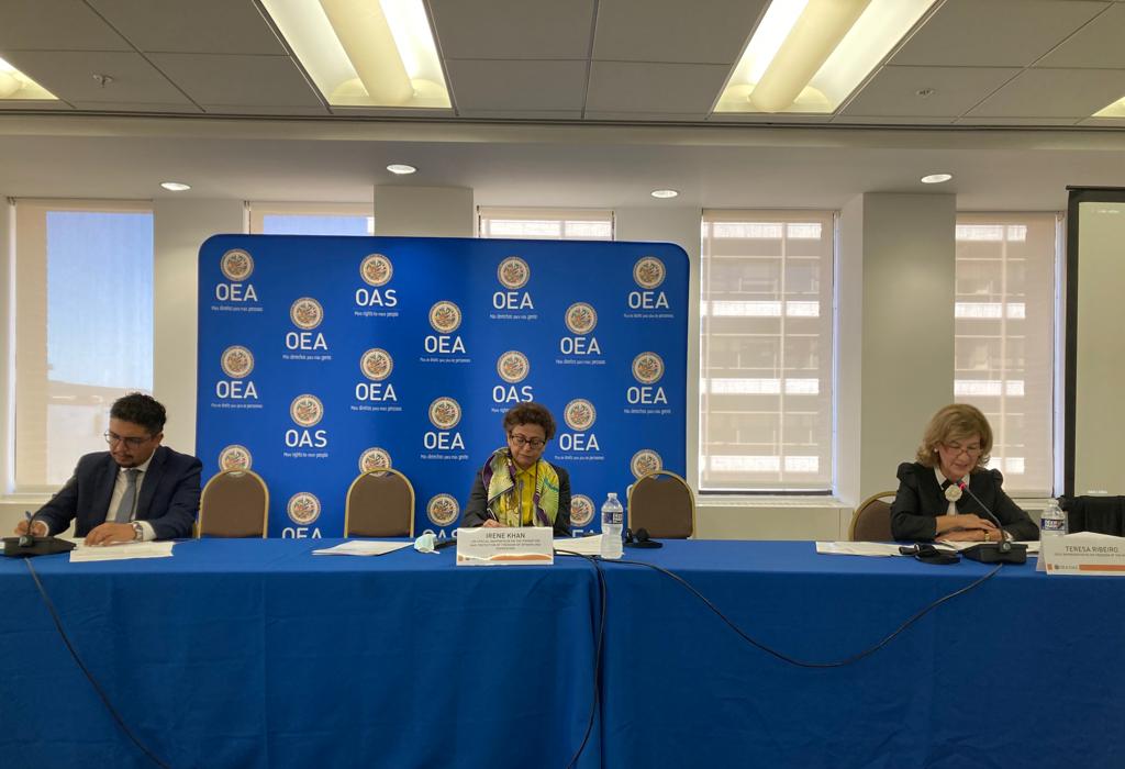 From left to right: OAS Special Rapporteur on Freedom of Expression Pedro Vaca Villarreal, UN Special Rapporteur on the Protection and Promotion of Freedom of Opinion and Expression Irene Khan and OSCE Representative on Freedom of the Media Teresa Ribeiro during the launch of their 2021 Joint Declaration on Politicians and Public officials and Freedom of Expression.