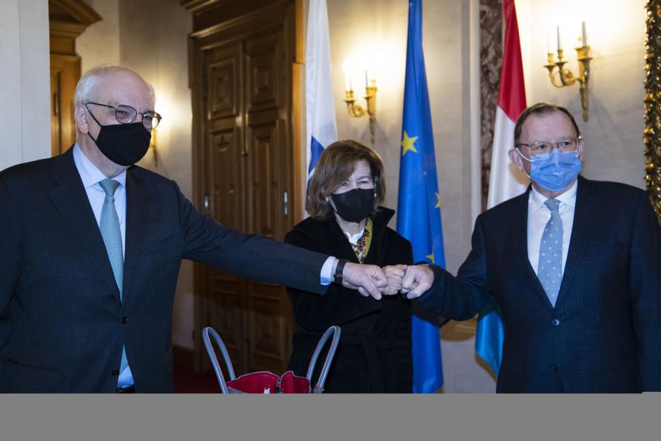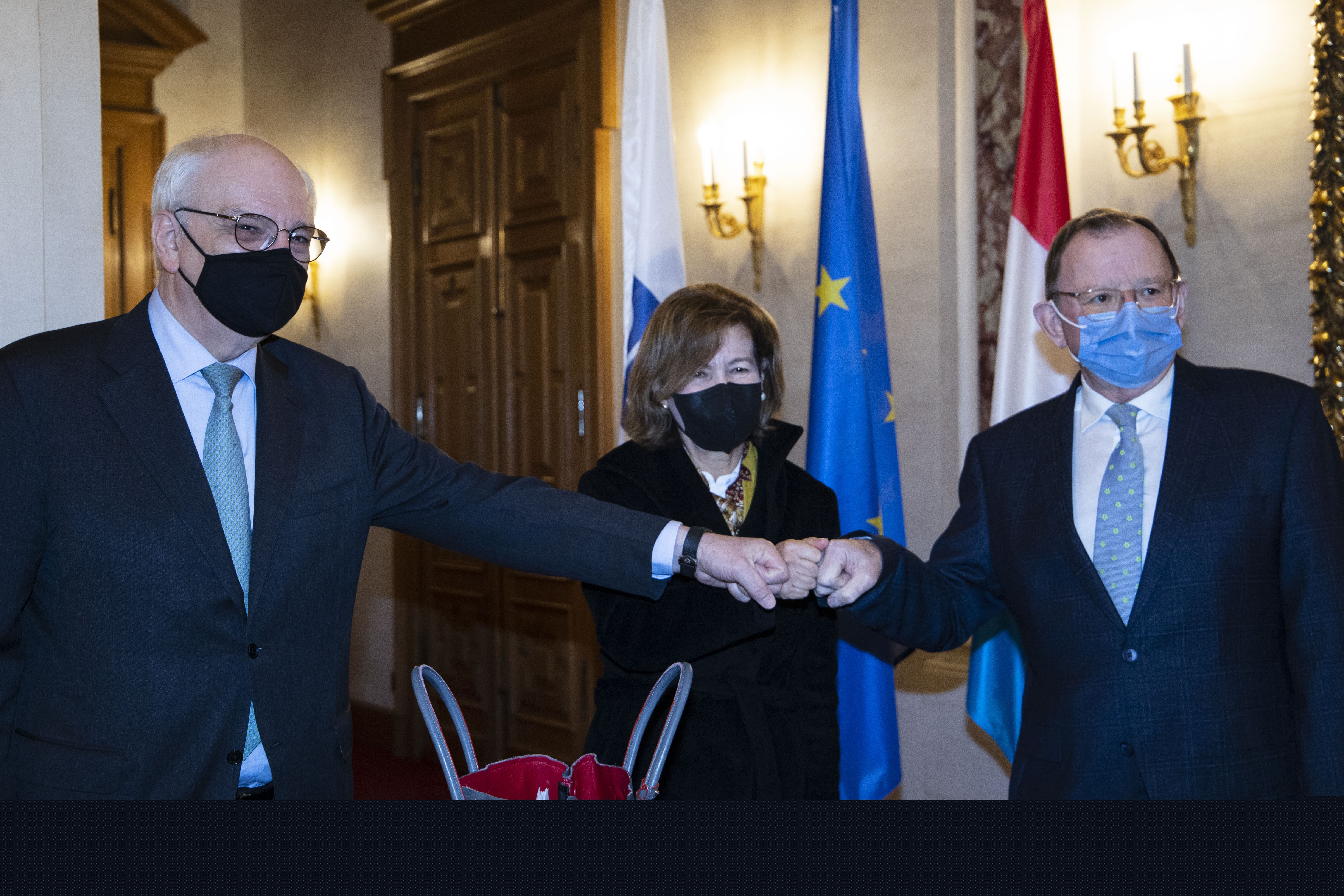 OSCE Representative on Freedom of the Media Teresa Ribeiro during her visit to Luxembourg where she met, amongst others, with President of the Parliament Fernand Etgen (r) and President of the Parliamentary Committee on Digitalisation, Media and Communications Guy Arendt, 28 January 2022