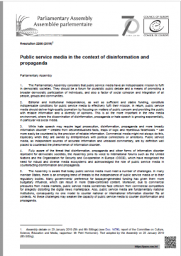 Parliamentary Assembly of the Council of Europe Resolution 2255 (2019)1: Public service media in the context of disinformation and propaganda