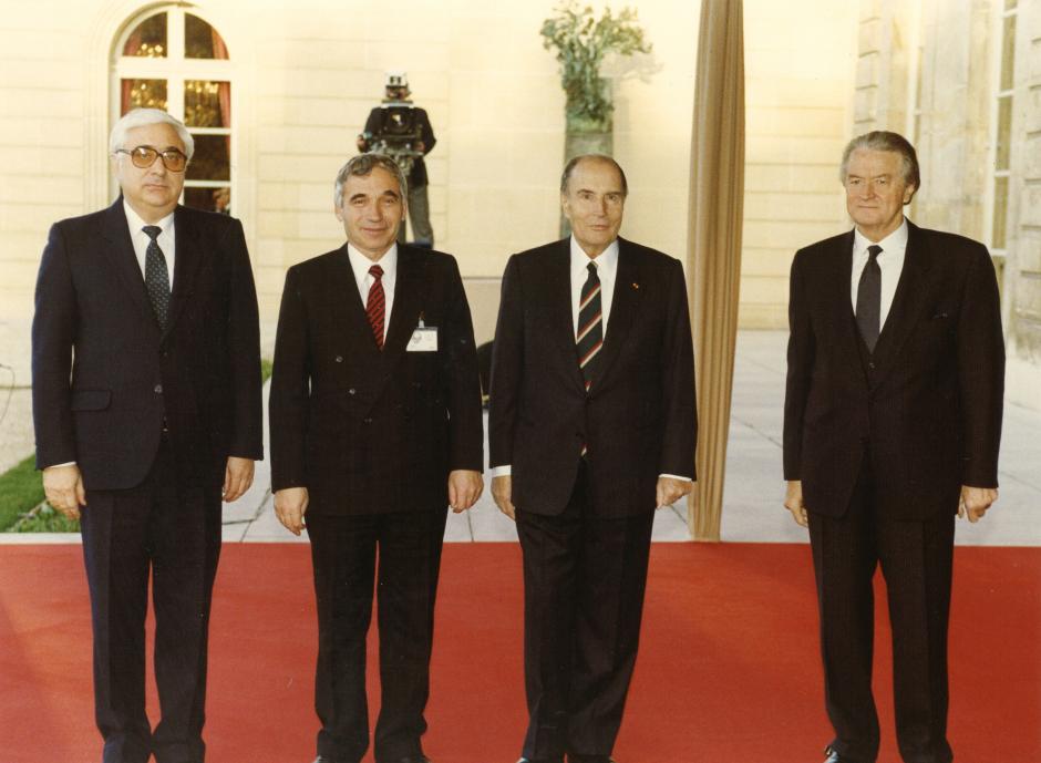 Monsieur Jeliou JELEV, Président de la République de Bulgarie, Monsieur Andrey LOUKANOV, Président du Conseil des Ministres, Monsieur François MITTERRAND et Monsieur Roland DUMAS
