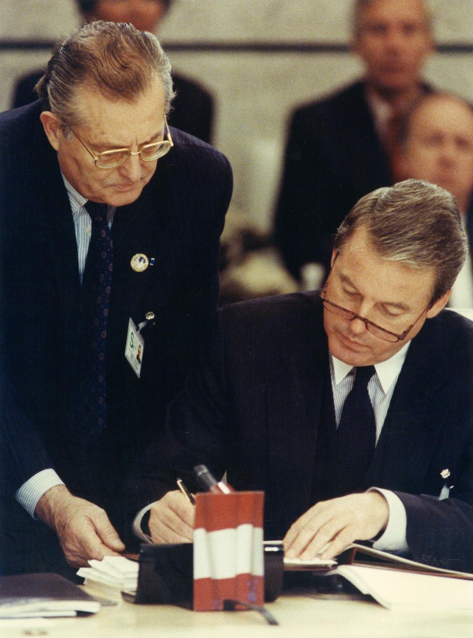 Signature de la Charte de Paris: Centre de Conférences Internationales, Mercredi 21 Novembre 1990. Monsieur Franz VRANITZKY, Chancelier Fédéral d'Autriche