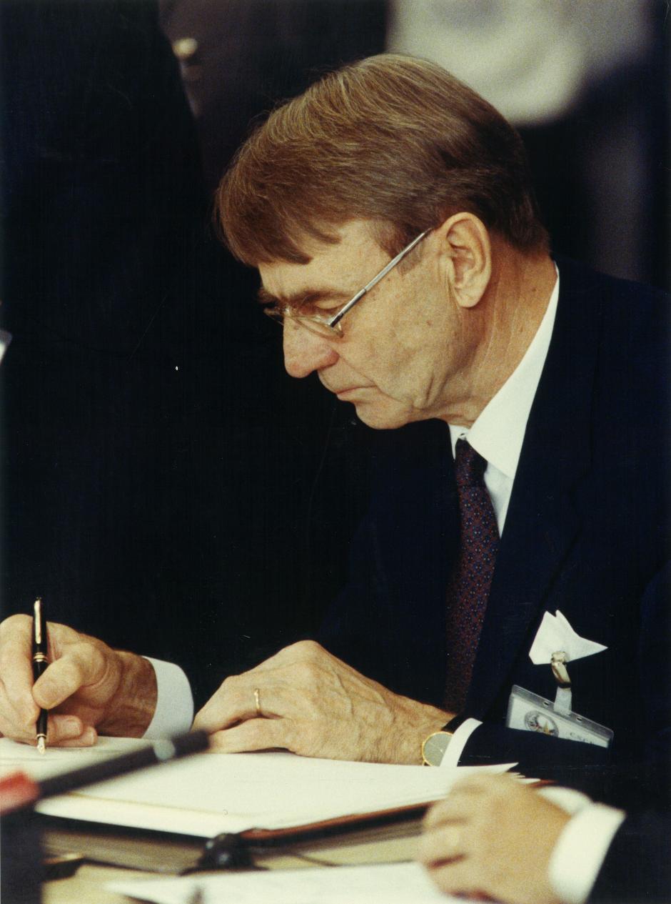 Signature de la Charte de Paris: Centre de Conférences Internationales, Mercredi 21 Novembre 1990. Monsieur Mauno KOIVISTO, Président de la Finlande