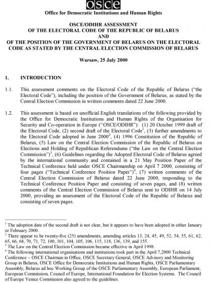 This assessment comments on the Electoral Code of the Republic of Belarus (“the Electoral Code”), including the position of the Government of Belarus, as stated by the Central Election Commission in written comments dated 22 June 2000.