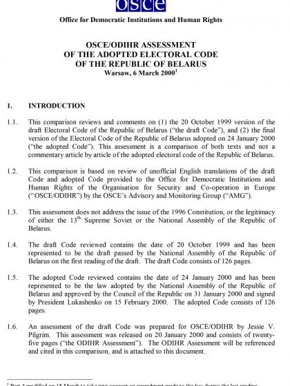 This comparison reviews and comments on (1) the 20 October 1999 version of the draft Electoral Code of the Republic of Belarus (“the draft Code”), and (2) the final version of the Electoral Code of the Republic of Belarus adopted on 24 January 2000 (“the adopted Code”). This assessment is a comparison of both texts and not a commentary article by article of the adopted electoral code of the Republic of Belarus.