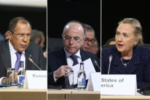 The Heads of Delegation of the OSCE Minsk Group Co-Chair countries: (l-r) Foreign Minister of the Russian Federation Sergey Lavrov, Minister Delegate for European Affairs of France Bernard Cazeneuve, and Secretary of State of the United States Hillary Rodham Clinton, at the 2012 OSCE Ministerial Council in Dublin, 6 December 2012.