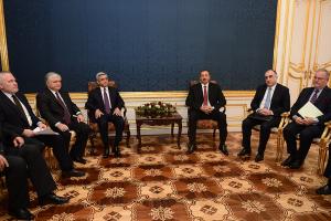 A meeting between the President of Armenia Serzh Sargsyan and President of Azerbaijan Ilham Aliev, alongside Foreign Minister of Armenia Edward Nalbandian and Foreign Minister of Azerbaijan Elmar Mammadyarov. The meeting was conducted with the participation of the Co-Chairs of the OSCE Minsk Group: Igor Popov of Russia, Jacques Fore of France, and (not pictured) James Warlick of the US, and Personal Representative of the OSCE Chairman-in-Office Andrzej Kasprzyk, Vienna, 19 November 2013.