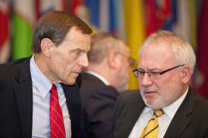 Two of the Co-Chairs of the OSCE Minsk Group, Ambassadors Igor Popov (r) of the Russian Federation and Robert Bradtke of the United States, have a conversation prior to addressing the OSCE's Permanent Council in Vienna, 8 November 2012.