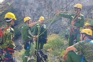 Rescuers from Tajikistan’s Committee of Emergency Situations and Civil Defence during practical sessions of a two-week training course on “Mountaineering- rescue operations in mountain conditions”, Varzob district, Tajikistan, 31 July 2023.