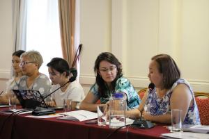 Expert Nadine Gogu from Moldova discusses a case with participants at an OSCE-organized course on media literacy, Ashgabat, 20 October 2023