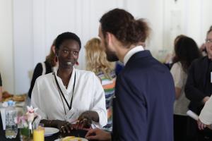 Zemfira Kondur, Senior Project Officer at the Council of Europe Office in Ukraine (right), and Cristi Mihalache, ODIHR Senior Adviser on Roma and Sinti Issues (left), at an ODIHR conference on the vital role of civil society in addressing issues related to migration, human rights and inclusion. Warsaw, 28 June 2022.