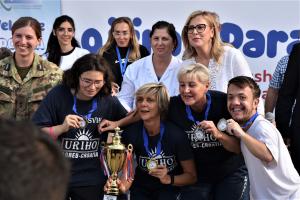 Kosovo Police officer and a participant of Para Sports Games for people with special needs compete in arm wrestling, 17 September 2023