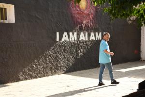 A DokuFest volunteer walks past the 2023 DokuFest’s theme “I AM AI AM I,” Prizren, 8 August 2023