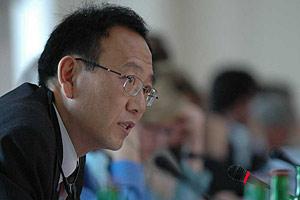 Member of the Delegation of Tajikistan and Chairman of the Association of Soviet Koreans of Tajikistan, Viktor Kim, speaks at the 13th Economic Forum, Prague, May 2005.